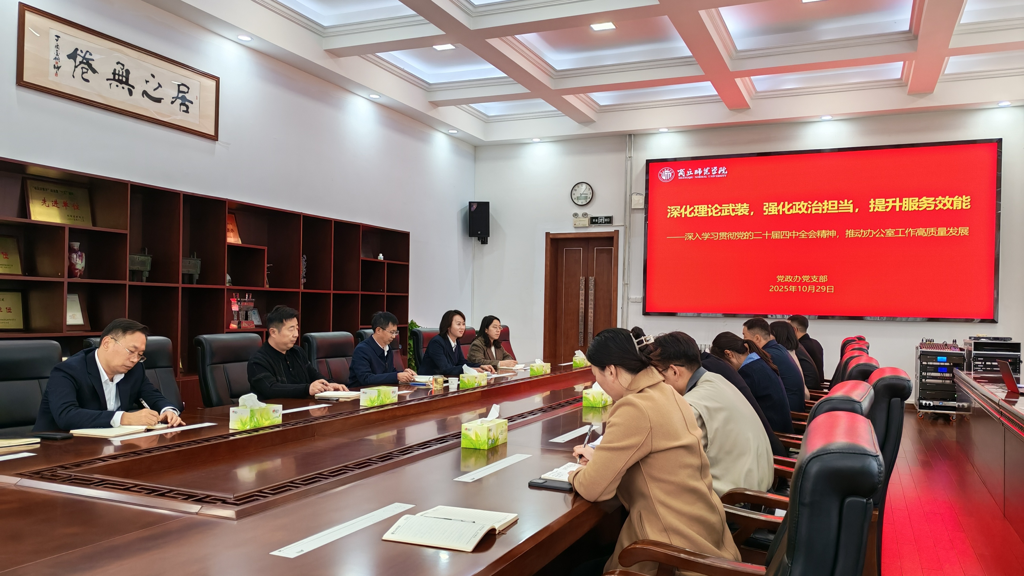 会议指出,党的二十届四中全会是在向第二个百年奋斗目标进军的关键节点召开的一次重要会议,为新时代新征程党和国家事业发展指明了方向。党政办公室作为学校的中枢机关,必须始终保持高度的政治敏锐性和责任感,在学习贯彻全会精神上走在前、作表率,切实将学习成果转化为推动工作的强大动力。